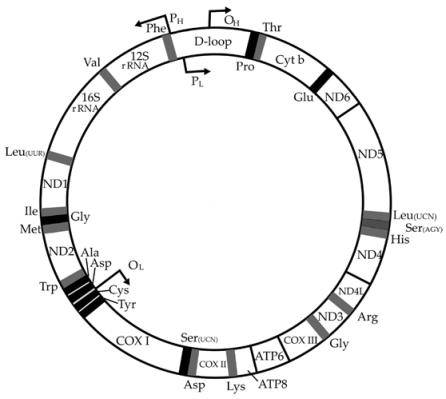 Humans have two repositories for genes (instructions coded in DNA) within a cell: chromosomal DNA and mitochondrial DNA. Genes stored in your chromosomes (22 of them, and XX if you are female or XY if male) are linear sequences of nucleotides about 3,000 Mb (million bases) in size. Mitochondrial DNA is a very small circular piece of DNA (about 16kb in size). mtDNA is 16,568 base pairs in length and encodes 13 proteins, 22 distinct transfer RNAs (tRNA) and two ribosomal RNAs (rRNA).