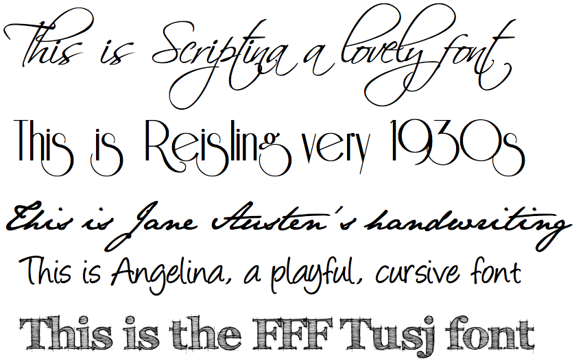 Here are a few of my favourites: Scriptina, Riesling, Jane Austen, Angelina, and FFF Tusj, which is a hand-sketched version of "Georgia". This last one really only works in large font sizes. Many of these fonts are only possible using the OpenType specification, which is superior to Apple's TrueType format, and allows for overlapping characters and better ligatures. |